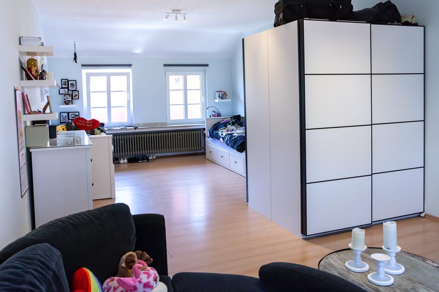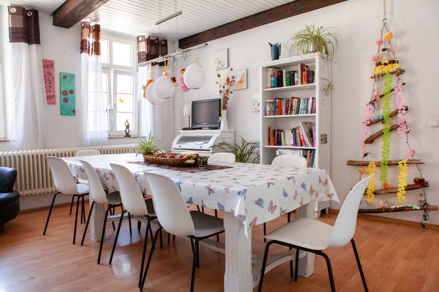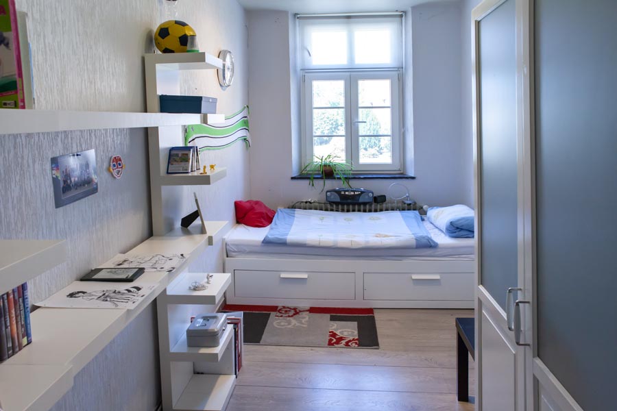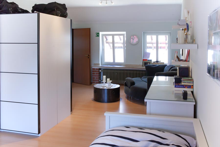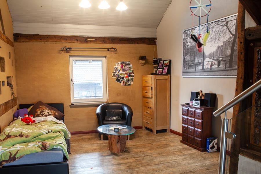 Der Bereich der Verselbstständigung befindet sich in zwei separaten Wohnungen des Jugendhof Genfeld. Die erste Wohnung mit 100qm Wohnfläche bietet Platz für zwei Bewohner. Im Obergeschoss befinden sich zwei Zimmer, eine kleine Diele am Treppenaufgang und das Badezimmer. Im Untergeschoss befindet sich das große Wohn- und Esszimmer und die Küche.
