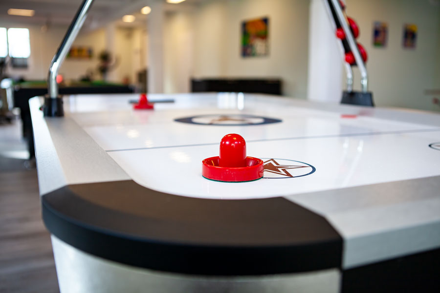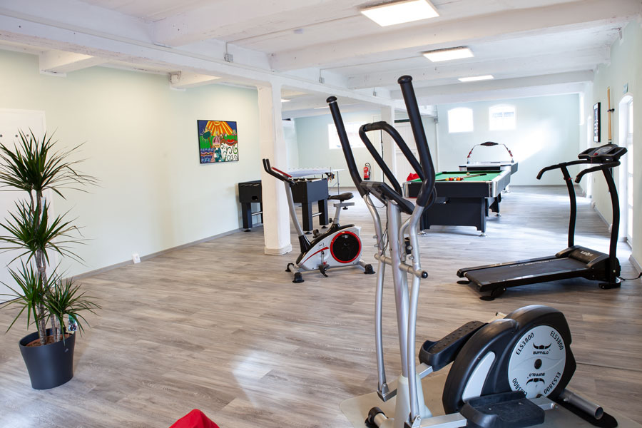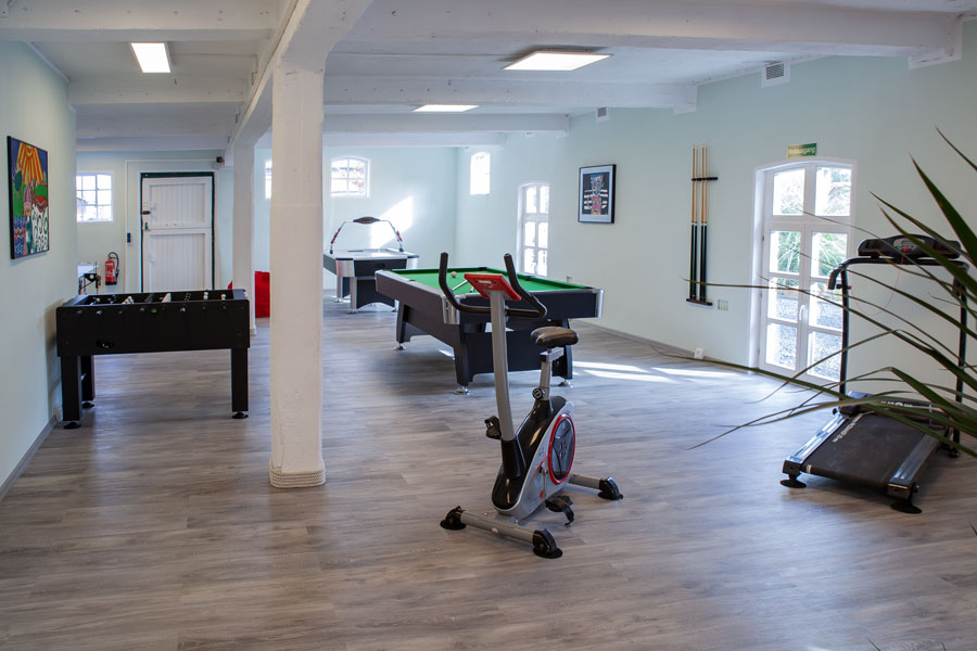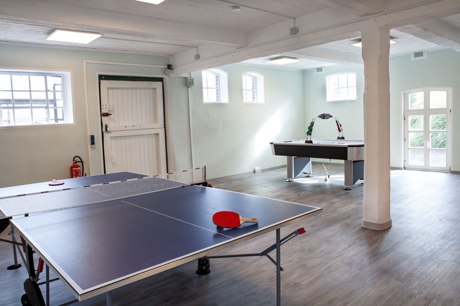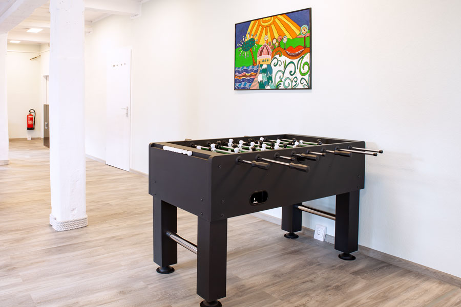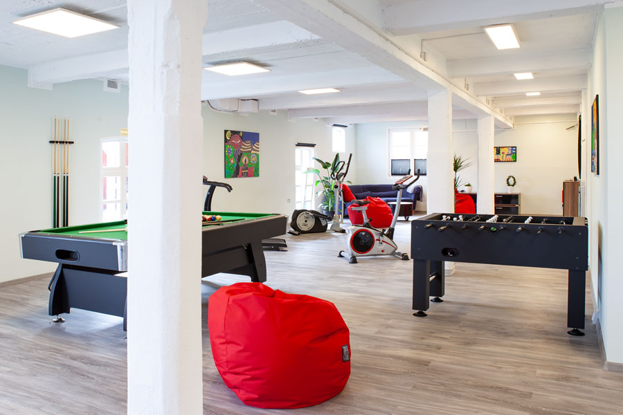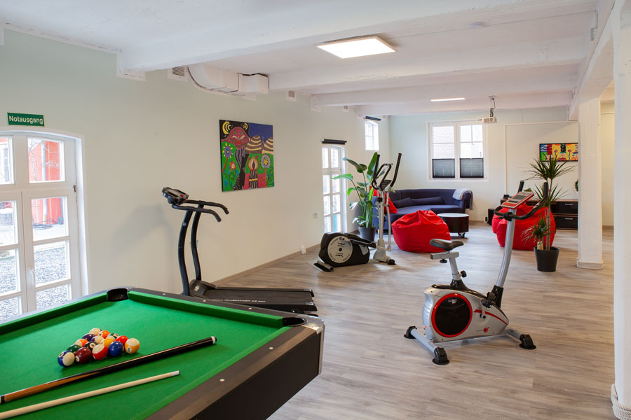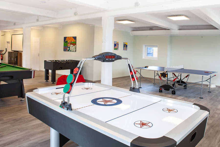 Der neue Freizeitraum bietet für unsere Kinder viele Beschäftigungsmöglichkeiten – gerade dann wenn das Wetter mal nicht so gut sein sollte für Aktivitäten an der frischen Luft. Neben Sportgeräten wie einem Laufband, einem Ergometer und einem Cross-Trainer befinden sich noch eine Tischtennisplatte, ein Pool-Billardtisch, ein Kicker und ein Air-Hockey-Tisch für sportlichen Spielspaß.