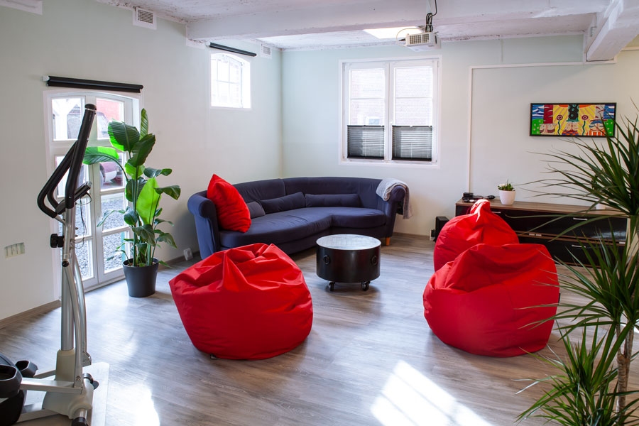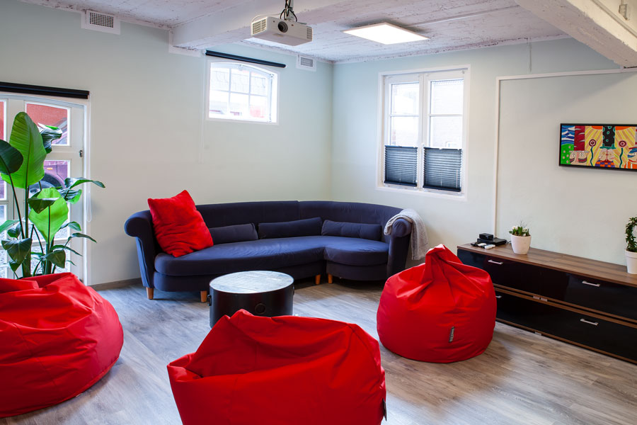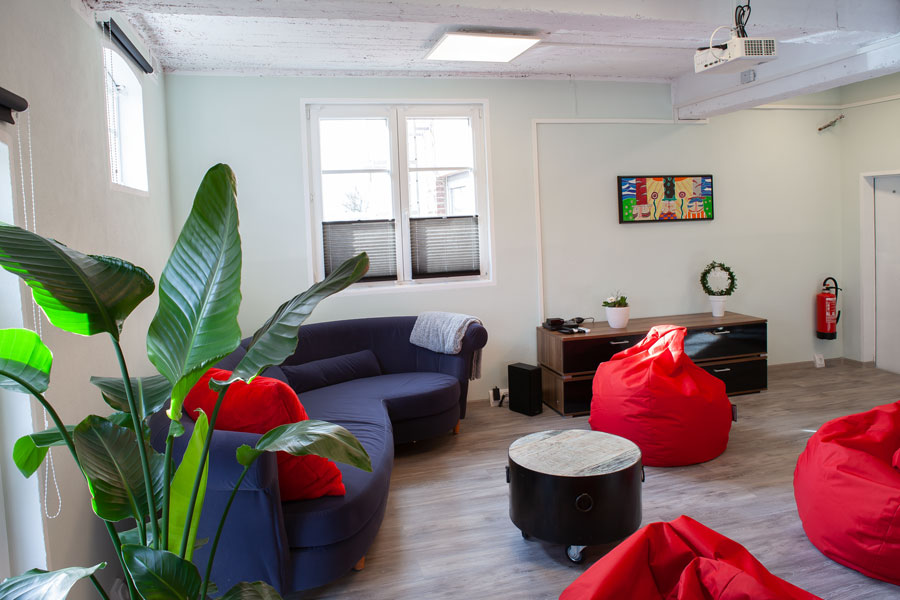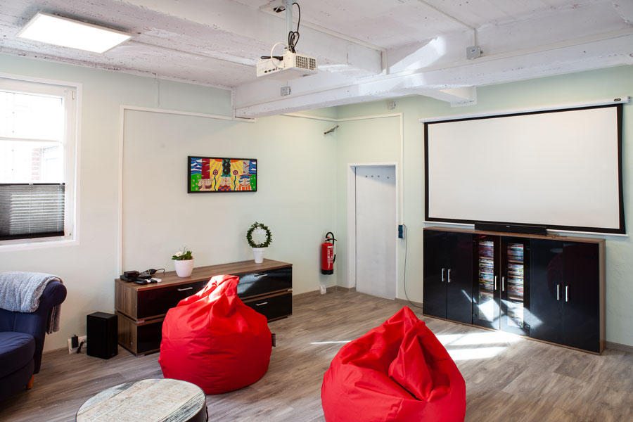 Zum enspannen kann man sich dann in die Film- und Fernseh-Lounge begeben. Gemütliche Sitzgelegenheiten vor einer Leinwand mit Beamer laden zu relaxtem Popcorn-Kinoerlebnis ein.